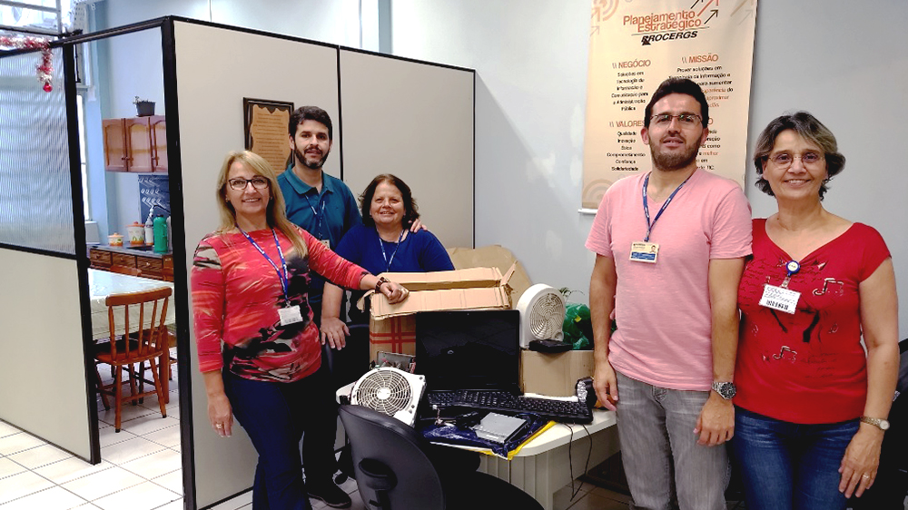 A feira de Descarte de eletroeletrônicos, realizada pela PROCERGS, coordenada pela área de Responsabilidade Sócio Ambiental (RSA), recebeu da Coordenadoria Regional de Pelotas, da companhia, duas caixas de resíduos eletroeletrônicos. Esse é o resultado do trabalho realizado periodicamente pela regional e que efetua o recolhimento de notebooks, micro computadores, carregadores de baterias, aparelhos celulares, lanternas e outros componentes.